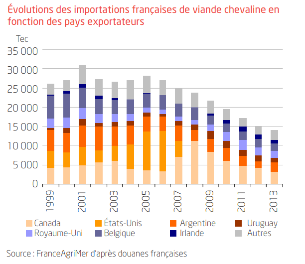 La France importe et exporte des chevaux vivants destinés à la boucherie : elle envoie ses propres chevaux vers l’Italie et l’Espagne, et fait venir des chevaux de Pologne. Mais la majeure partie de ses importations se font en viande fraîche ou congelée en provenance du Canada et de l’Amérique latine.