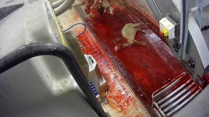 Les animaux sont tués encore sensibles et conscients, et certains sont découpés alors qu’ils sont encore vivants. Des animaux sont manipulés avec brutalité avant leur mise à mort.