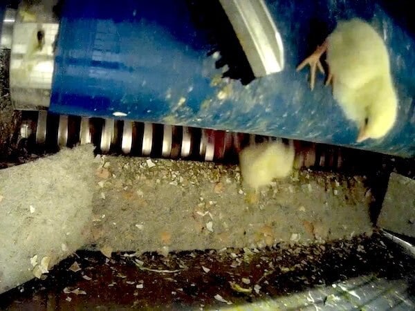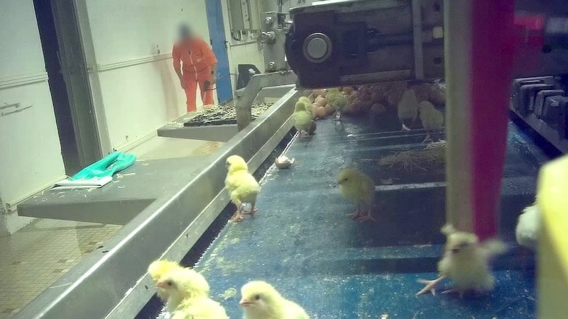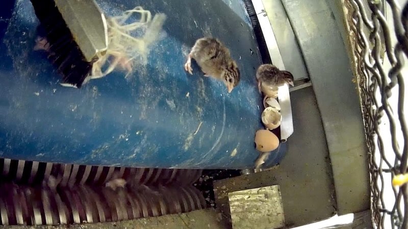 Les images sont terribles : au bout d’un tapis roulant, des oisillons tombent dans un broyeur qui les déchiquette vivants. Certains poussins subissent la cruauté d’un opérateur qui les écrase avec un balai raclette et les lance comme des balles dans le broyeur.