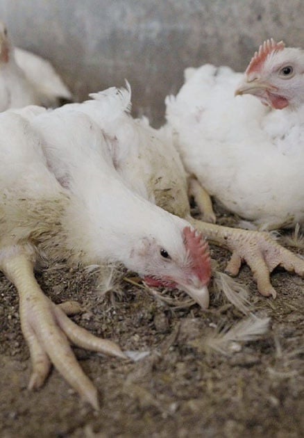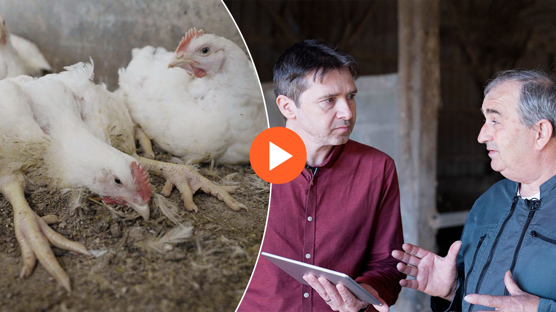Dans l’élevage filmé en Loire-Atlantique, 23 500 poulets sont entassés dans un bâtiment de 1 500 m². Ils sont nourris au soja OGM importé, supplémenté d’antibiotiques. Des poulets malades agonisent de longues heures, avant de mourir au milieu des vivants.