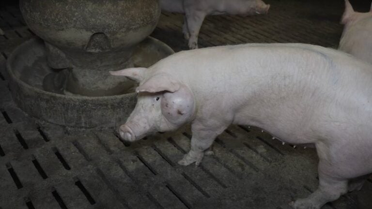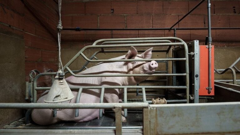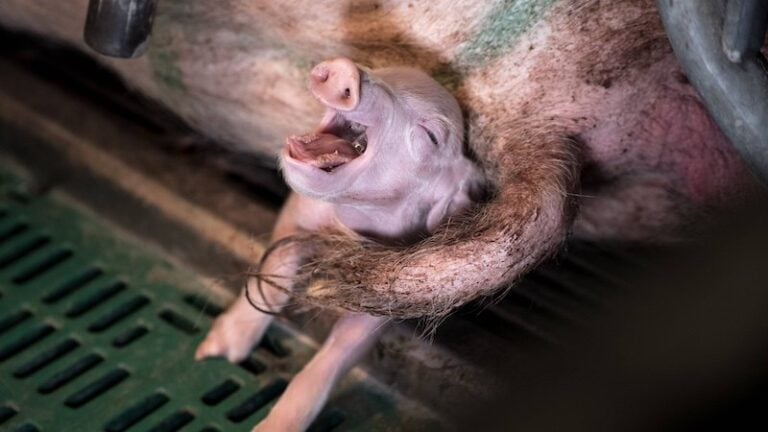 Dans les élevages qui approvisionnent Columbus Café & Co, les truies passent près de la moitié de leur vie enfermées dans des cages si étroites qu’elles ne peuvent même pas se retourner. Elles peinent à se lever, glissent, souffrent de lésions aux pattes et d’escarres. Incapables d’interagir avec leurs petits, qui les tètent à travers les barreaux, les truies souffrent d’un stress intense.