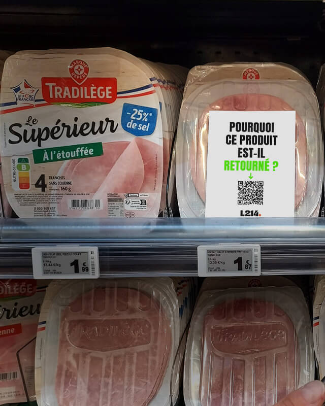 Si le personnel du supermarché t’interpelle, explique avec courtoisie que tu participes à un mouvement citoyen visant à alerter sur les pratiques révoltantes que cautionne E.Leclerc dans les élevages de cochons qui le fournissent.