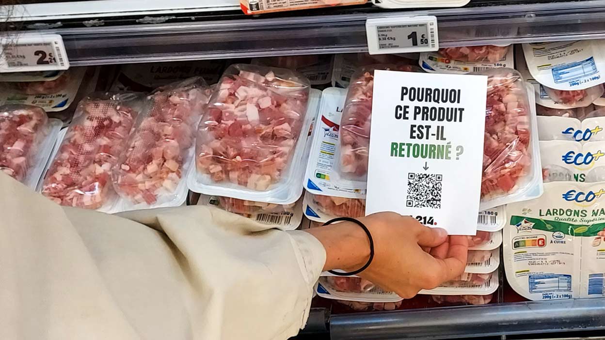 Retourne un maximum de produits à base de viande de cochons des marques E.Leclerc (Eco+ et Marque Repère) : jambon, charcuterie, etc. et remets-les à leur place dans le rayon, face retournée.